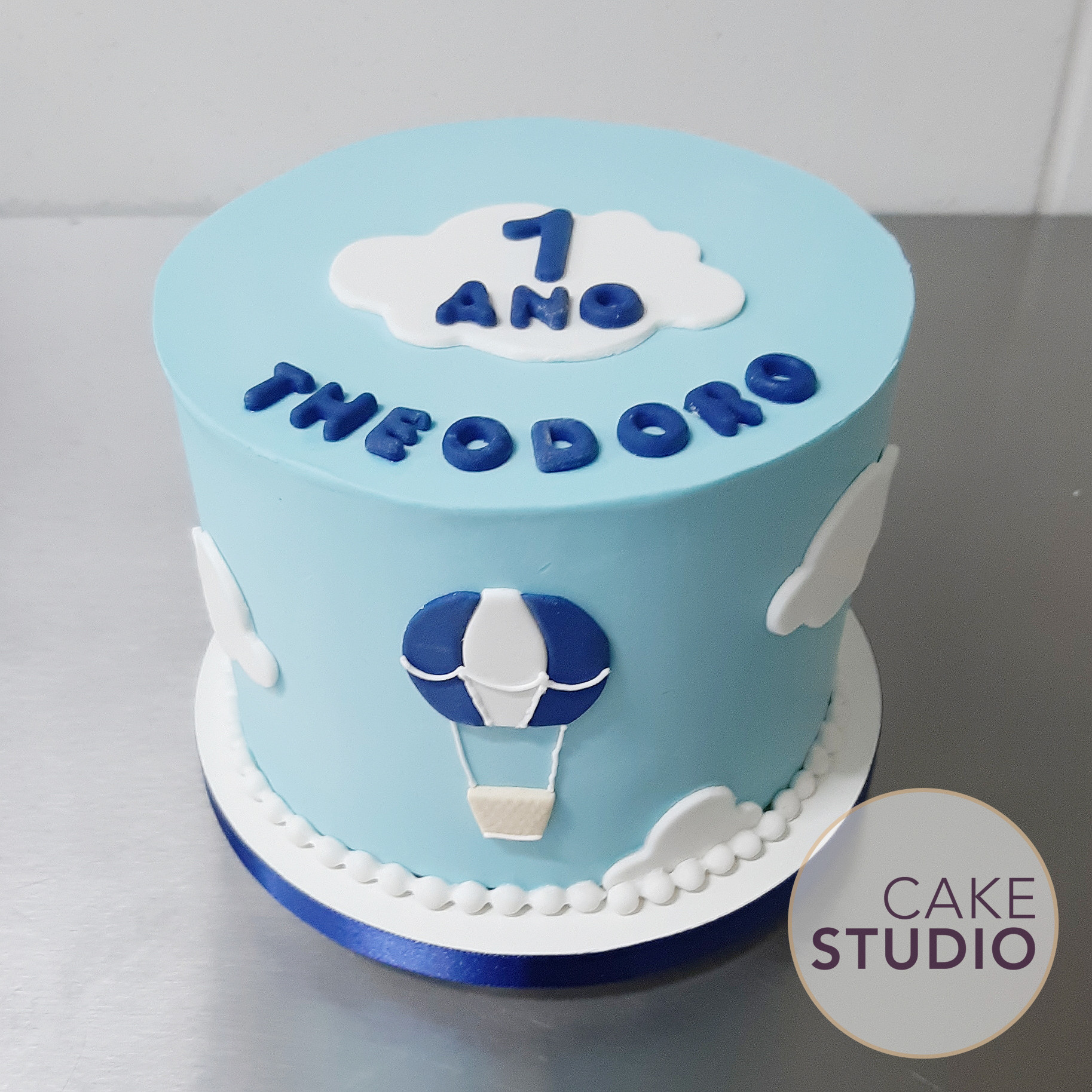 Lindo bolo de aniversário de 1 ano de menino decorado em pasta americana no tema nuvens e balão.