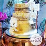 Um bolo de casamento elegante e luxuoso foi a escolha dos noivos que encomendaram este belíssimo semi-naked cake de casamento com base coberta por folhas de ouro comestível 24k e decorado com delicadas orquídeas de açúcar.