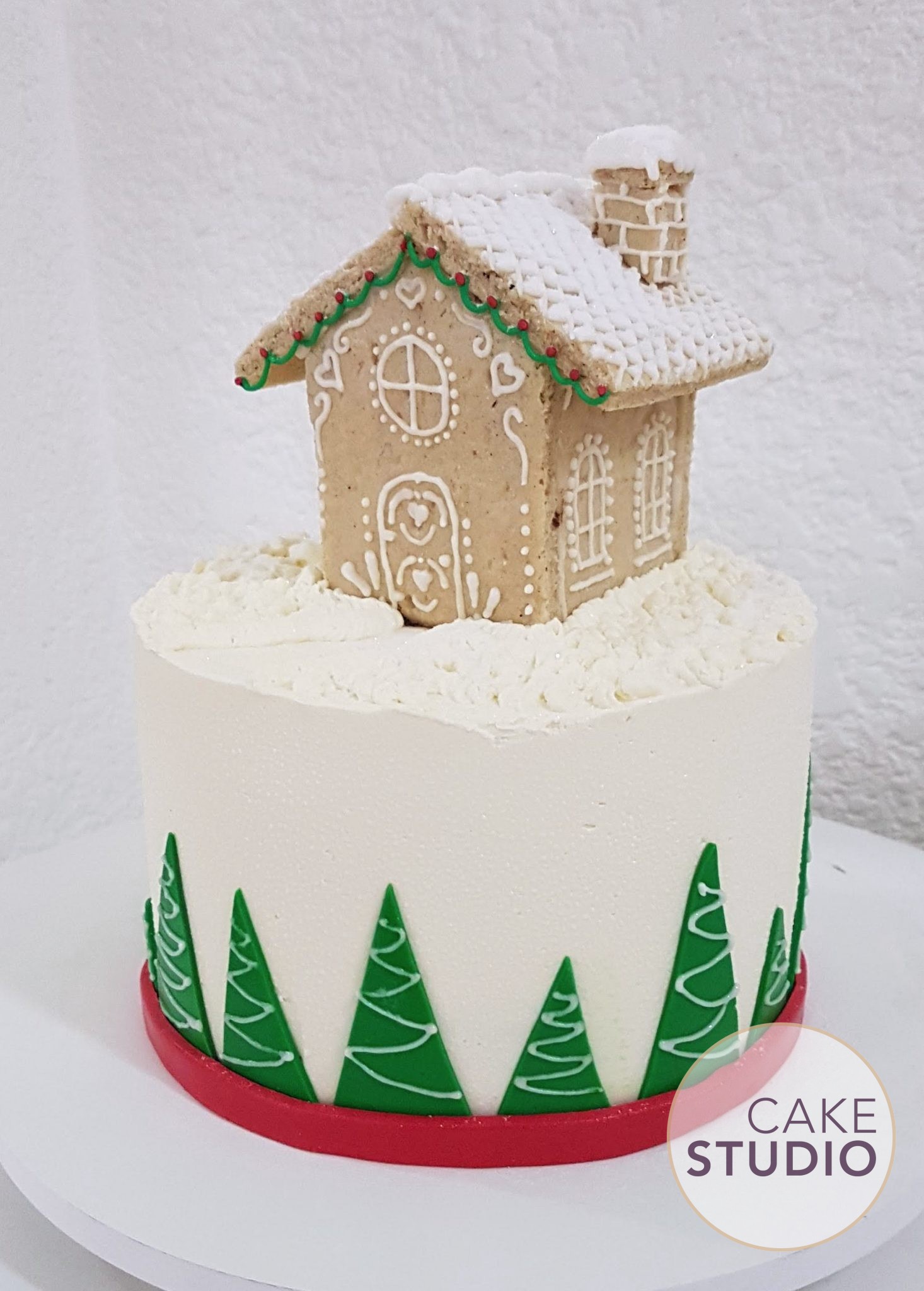 Bolo de Natal espatulado com pinheirinhos na lateral e um topo de bolo de Gingerbread House, a tradicional casinha de natal feita de biscoitos artesanais amanteigados com um toque de gengibre. Veja mais bolos decorados de Natal aqui.