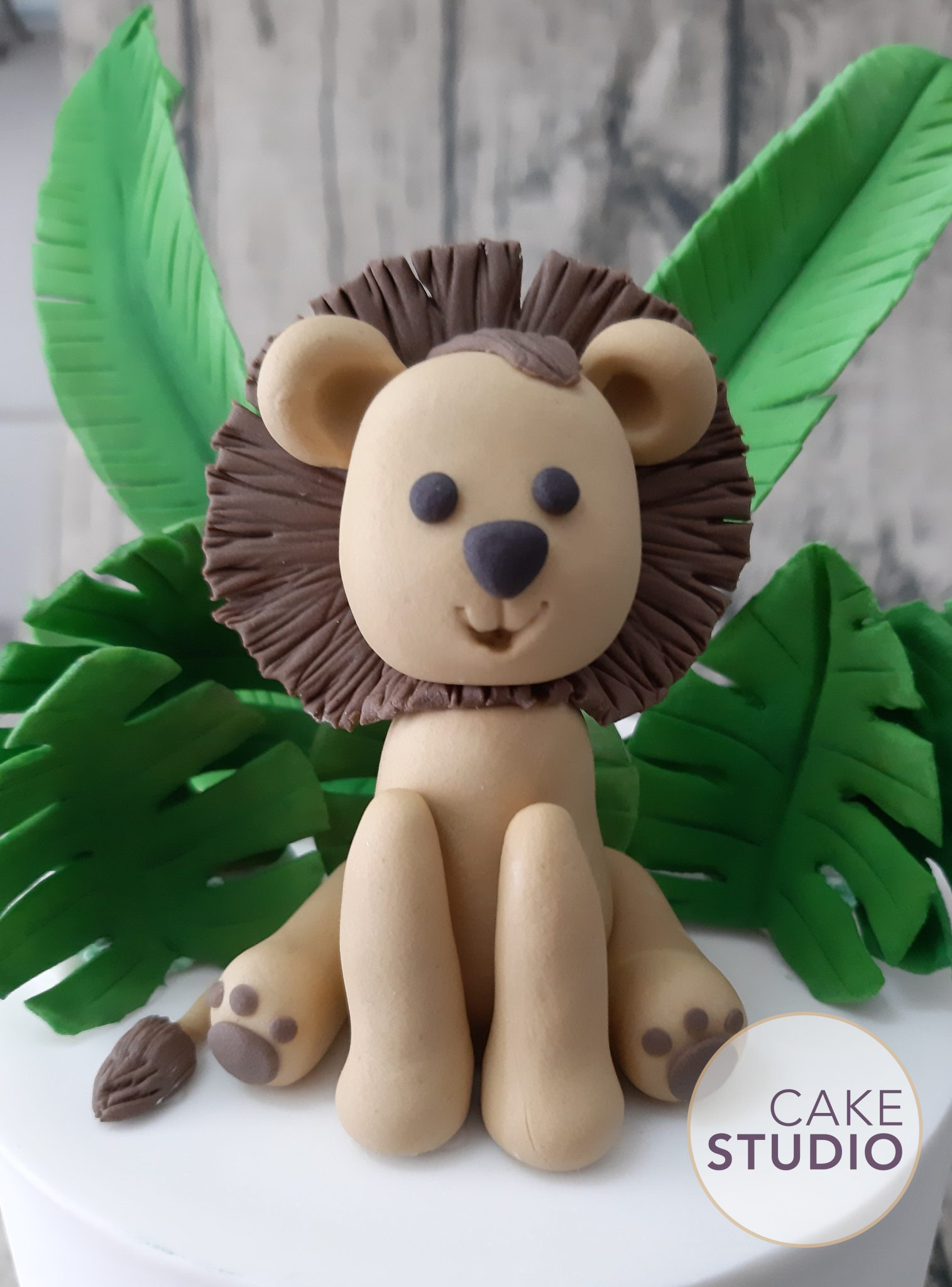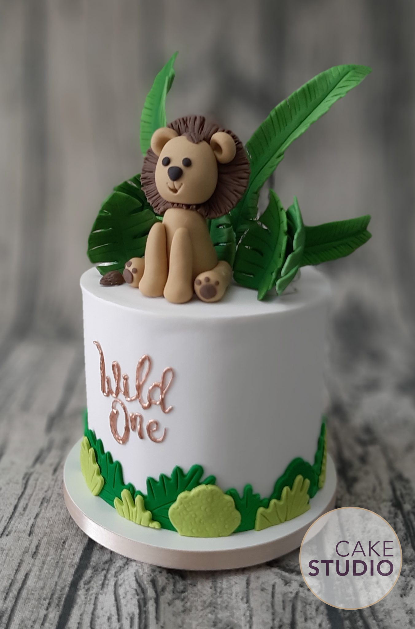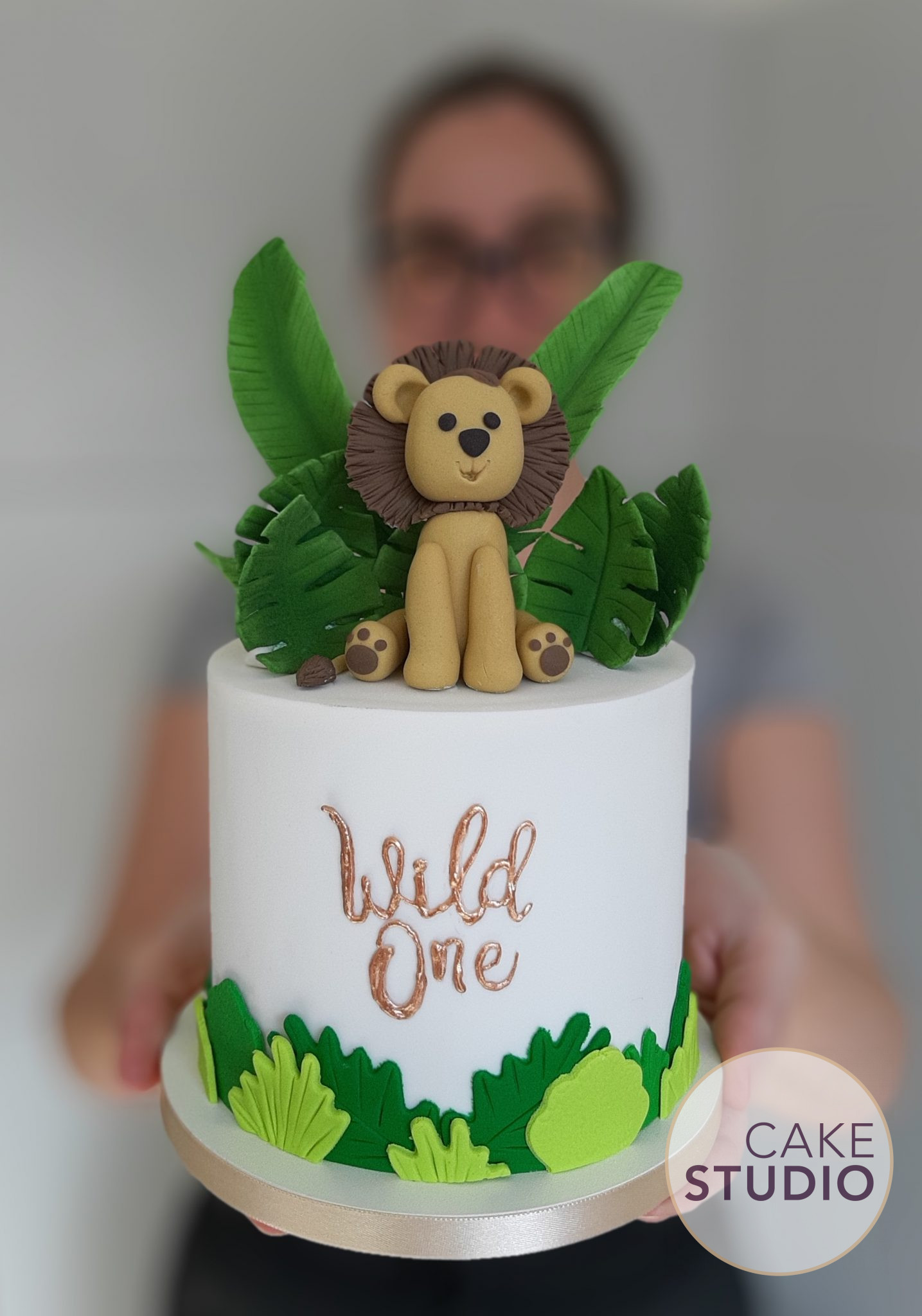 Aqui esta uma idéia de bolo de mesversário de menina diferente! Tema Leão na Selva, com topo de bolo de leãozinho, folhagens (reparem nas costelas-de-adão, que trendy!) e, na lateral, escrito “Wild One” em cobre (ou rosé gold), para celebrar o primeiro mês de gêmeas.