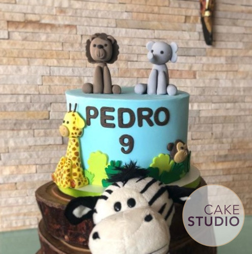 Criamos então um bolo decorado com animais em pasta americana: leão, girafa, elefante e até um macaquinho escondido entre as folhagens!