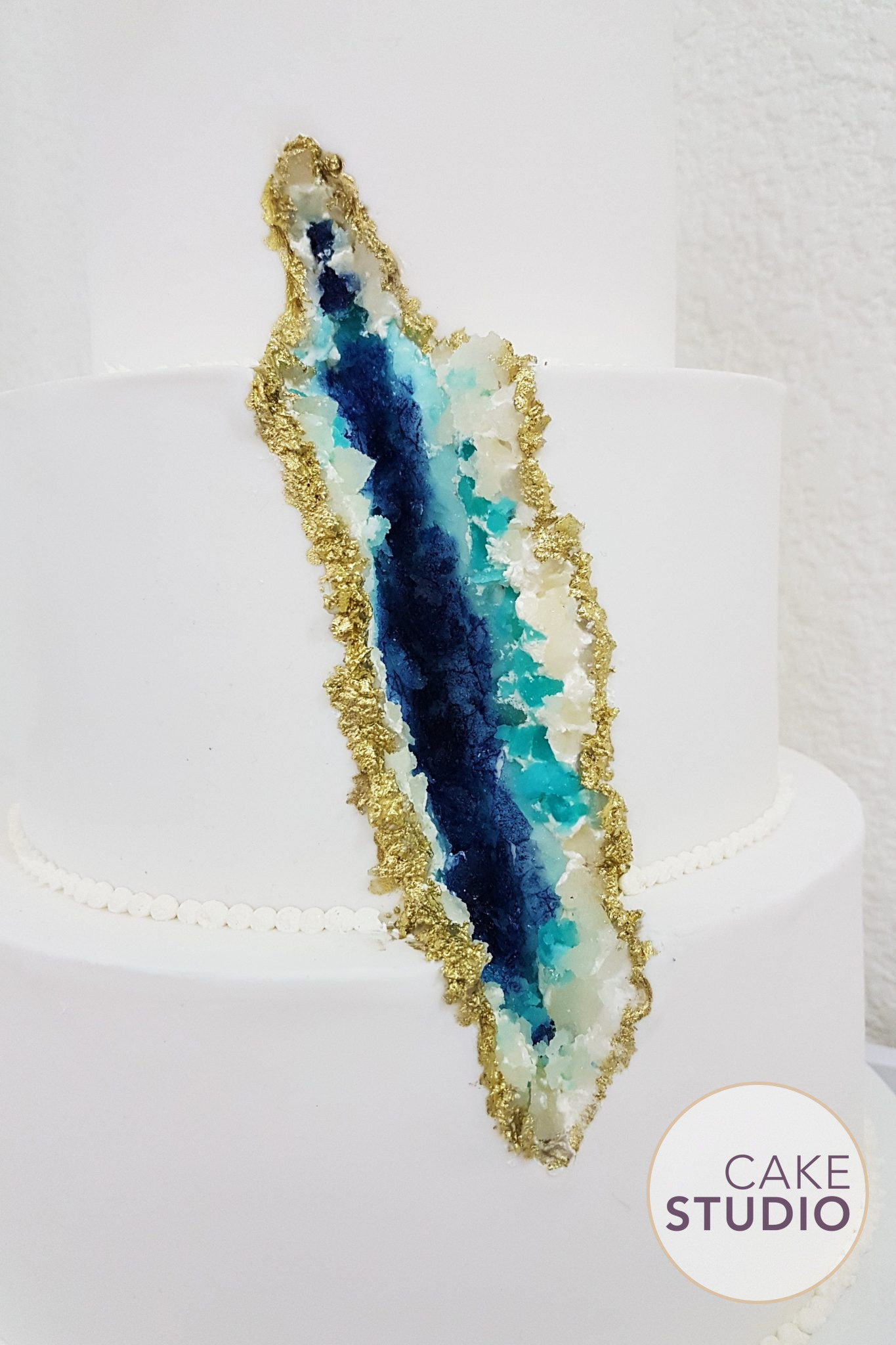 Bolo de casamento estilo Geode Cake, com fenda imitando geodo e topo de bolo personalizado com noivinhos debruçados espiando os cristais!