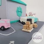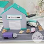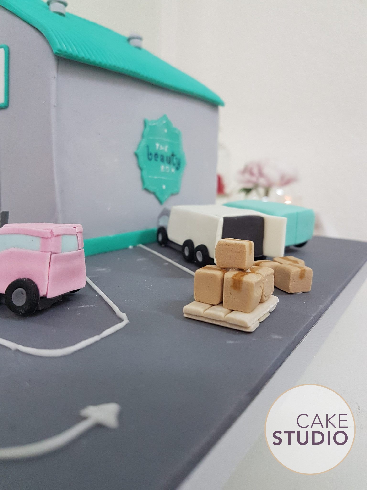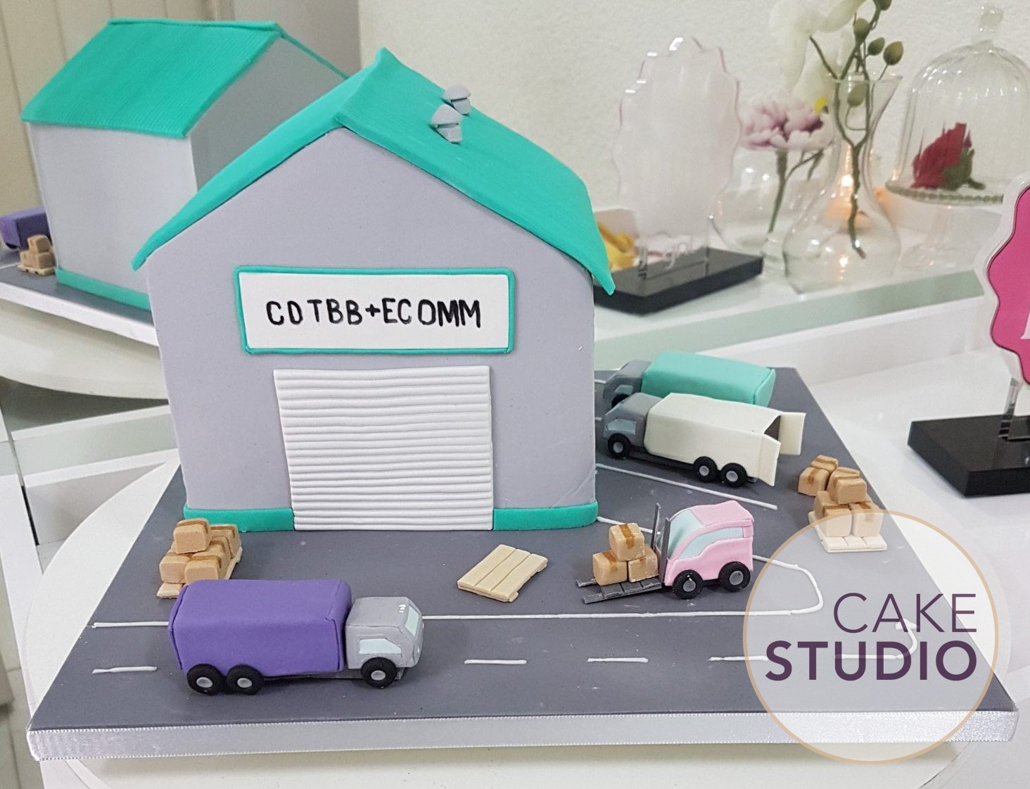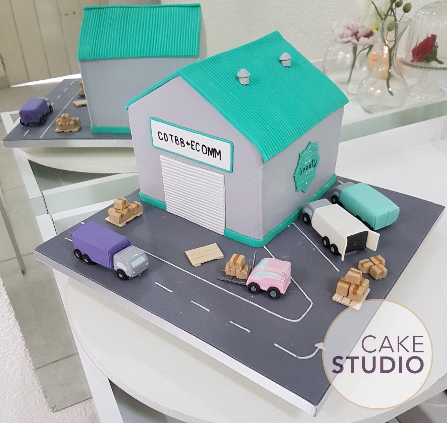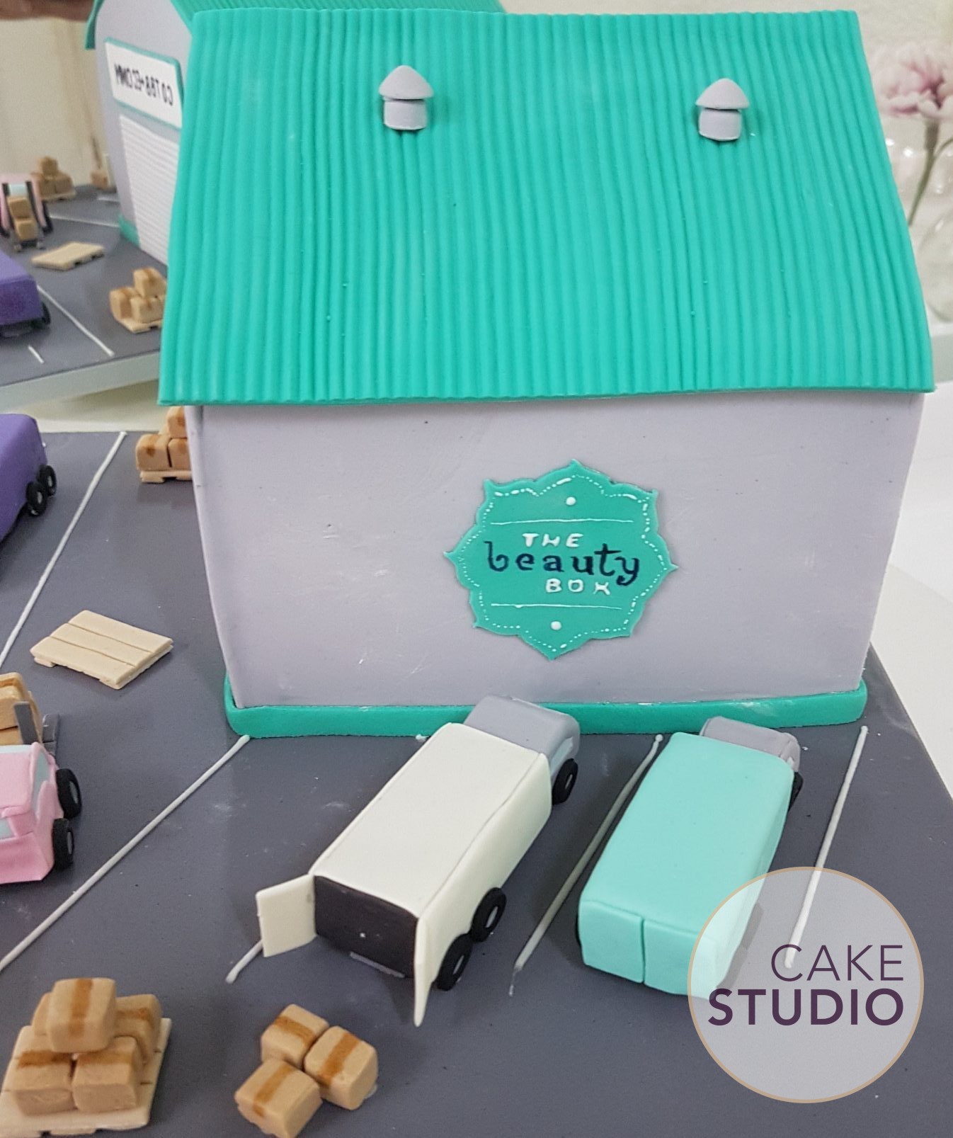 Quem disse que bolo corporativo não pode ser criativo? Veja este bolo maquete totalmente comestível feito para celebrar o lançamento de um novo Centro de Distribuição da The Beauty Box. A “casa” é um bolo de chocolate recheado coberto com ganache e pasta americana. Todos os elementos, caminhões, caixinhas e pallets também são comestíveis e deliciosos.